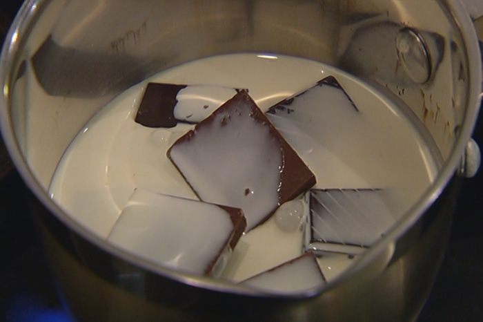 9. Приготовить глазурь: шоколад поломать, выложить в небольшую кастрюлю, влить сливки и все растопить на медленном огне. Новогодние капкейки