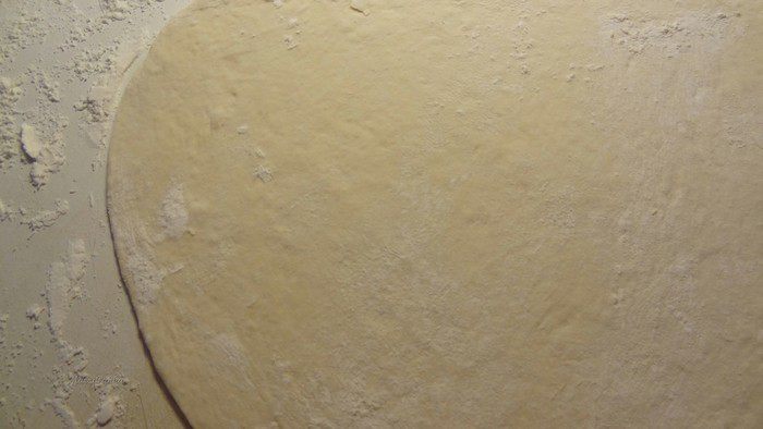 15. Вначале руками, а потом с помощью скалки (не забываем присыпать пирог и саму скалку мукой), раскатываем наш пирог до нужной нам толщины. Тут главное не увлечься!))) С одной стороны пирог должен быть тонко раскатан, но с другой стороны, если раскатать слишком тонко, то тесто порвется. Раскатанный пирог должен быть толщиной около 1,5-2 см. Осетинские пироги с двумя видами начинки