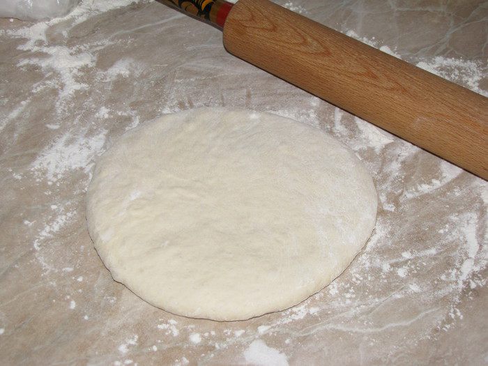6. Подошедшее тесто обмять на присыпанном мукой столе. Открытый пирог с мясом, картофелем и цукини