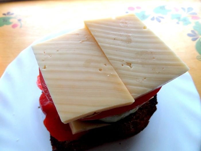 10. 2 ломтика ржаного хлеба подсушить в тостере или тоже обжарить слегка. Овощные башенки с сыром