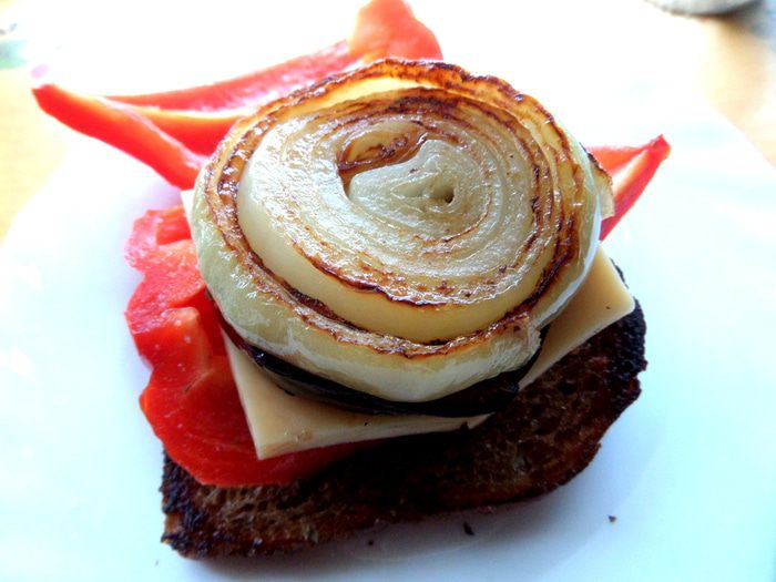 7. Обжарить (лучше на гриле!) баклажаны и лук с двух сторон. Овощные башенки с сыром