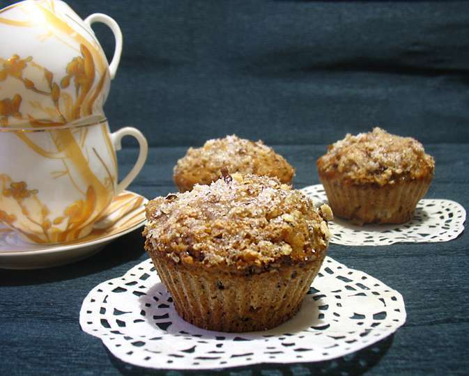 8. Заполнить формочки на 2/3 и сверху посыпать смесью из сахара и орехов. Овсяные кексы с грушей