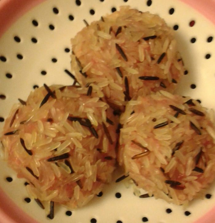 3. Затем в тарелку насыпаем смесь белого и темного риса, обваливаем наши фрикадели. Паровые фрикадельки с рисом