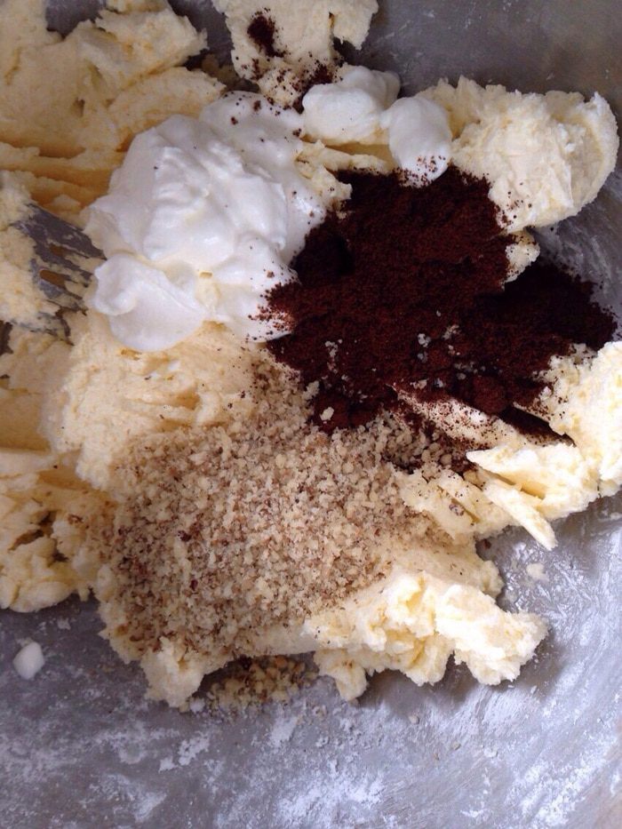 2. Добавить к маслу сметану, орехи, кофе и соль (буквально щепотку). Перемешать. Печенье "Кофе-грецкий орех"