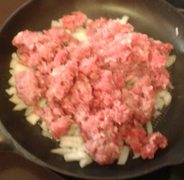 2. Тем временем подготовим начинку. Мясной фарш обжарить с мелко порезанным луком, посолить, поперчить, добавить отваренный рис. Пирог с мясом и рисом