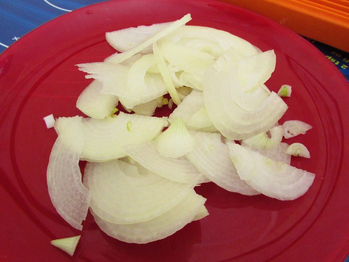6. Лук почистить и нарезать полукольцами. Пряная галета с картофелем, тыквой и луком