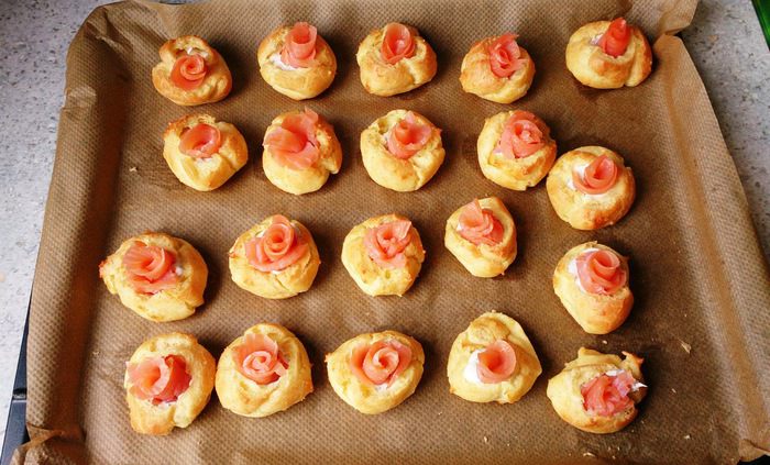 4. В предварительно разогретой до 200 градусов духовке выпекать 30 минут, затем убавить огонь и продолжить еще 10 минут. Профитроли с творожным сыром и семгой