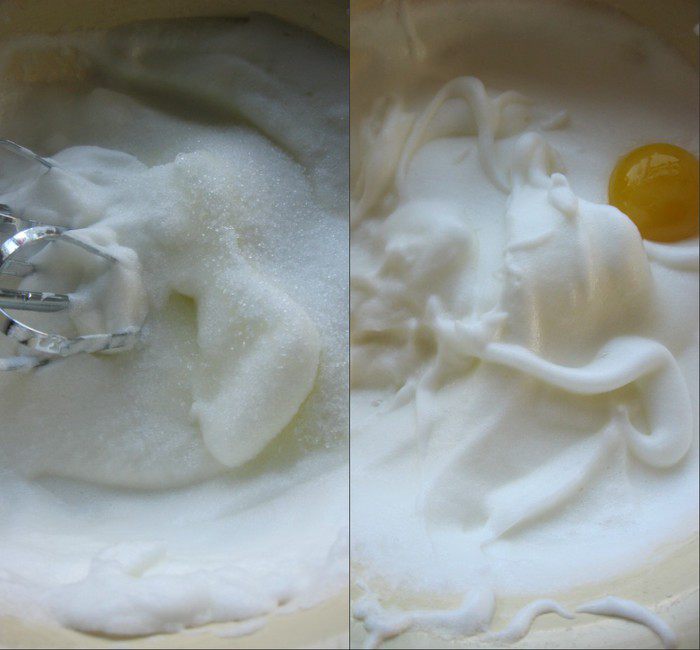 Белки взбить с щепоткой слои в крутую пену, добавить сахар.