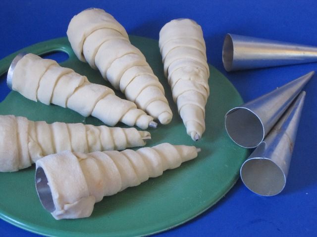 3. Взять полоску теста и намотать на металлический конус для выпечки трубочек. "Морковки" из слоеного теста с салатом