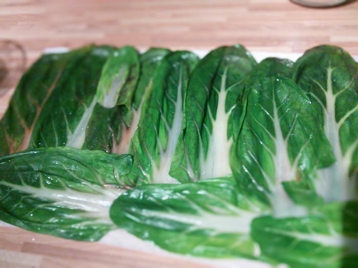 4. Так же как и у капустных листьев отрежьте уплотнения у стволов, бланшируйте в кипящей воде в течении минуты. Обдайте ледяной водой. Разноцветный рулет из лососевой форели