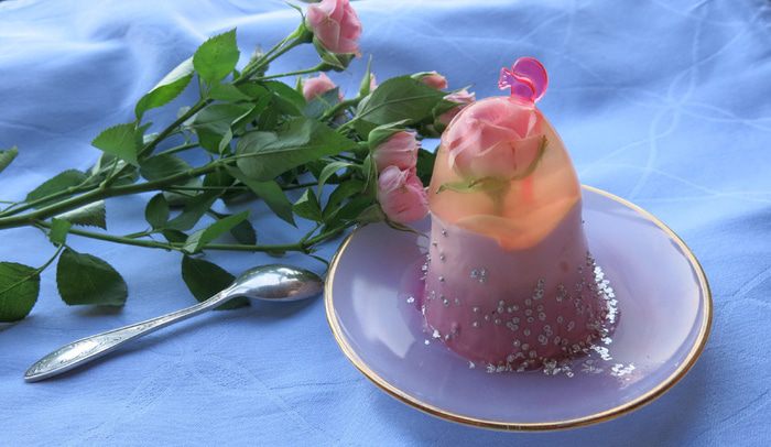 4. Заливаем полученным ранее прозрачным будущим желе, выше уровня бутона на 1 см примерно. Ставим всю конструкцию в холодильник застывать. Розовая элегия