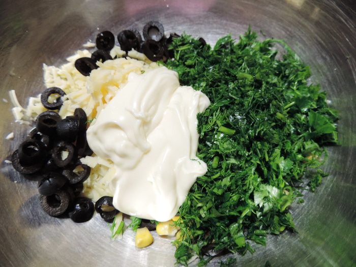 3. Тем временем приготовим начинку. На крупной терке натираем сыр, добавляем мелко нарезанные петрушку и укроп (точное количество зелени не указываю, но я люблю побольше), сметану, консервированную кукурузу (выбирайте), нарезанные кружочками маслины. Перемешиваем все до однородности. Рулет из фарша с начинкой