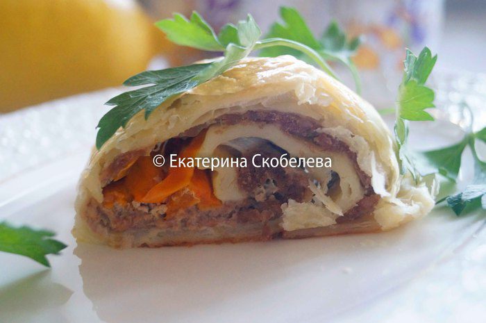 Рулет из слоеного теста с фаршем и болгарским перцем