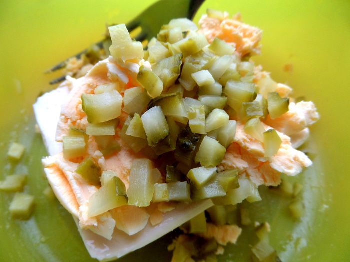 2. Сначала приготовим начинку: вылавливаем из баночки огурчик,даём стечь рассолу и нарежем на дольки. Почему огурец? Потому что я их обожаю и пикантности в начинке не помешает! Рыбные "ножки" под юбочкой из перцев