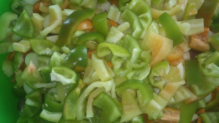 7. Теперь режем перчик. Тоже достаточно крупными кусочками. Красивее получается, когда перчик красный, но у меня в этом году такой... Салат из огурцов "Привет из лета"
