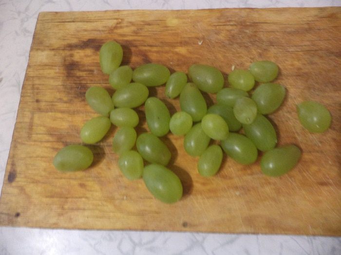 2. Виноград без косточек вымыть, оторвать ягоды от веточек, разрезать каждую виноградину пополам. Салат из пекинской капусты, винограда и сыра