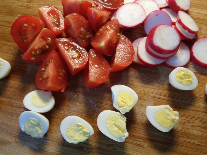 5. Редиску (у меня крупных 4 штуки) порезать кружочками. Помидоры черри (у меня крупные) на четвертинки, а сваренные вкрутую перепелиные яйца порезать пополам. Салат "Космополит"