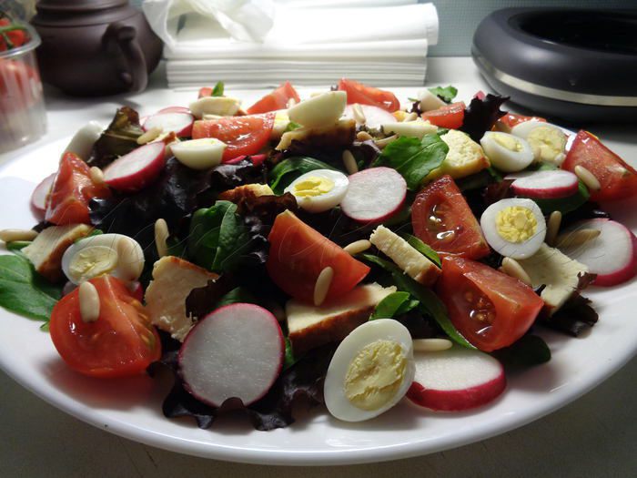 7. Украсить салат кедровыми орешками. Посолить и поперчить. Салат "Космополит"