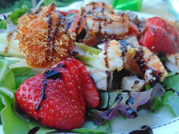 6. Собрать салат: на тарелку выложить листья, затем яблоки, горячего тунца и креветки, полить заправкой, клубнику и украсить бальзамическим кремом.
