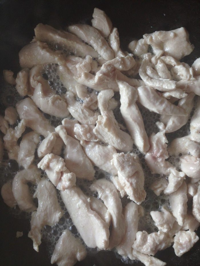 2. Куриное филе нарезаем тонкими полосками и обжариваем на растительном масле до румяного цвета. Остужаем.