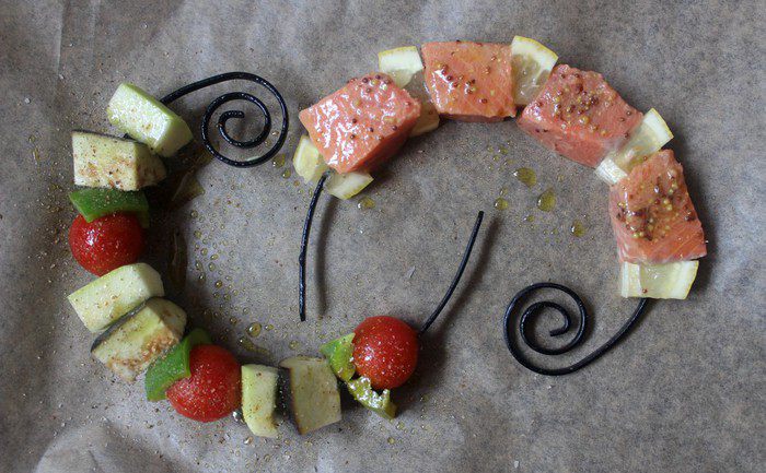 Шашлычки из лосося и овощей
