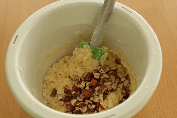 5. Отложите 4-5 слив в сторону. Остальные разрежьте пополам, удалите косточки и нарежьте кубиками. И добавьте в тесто. Сливовый пирог с орехами и шоколадом