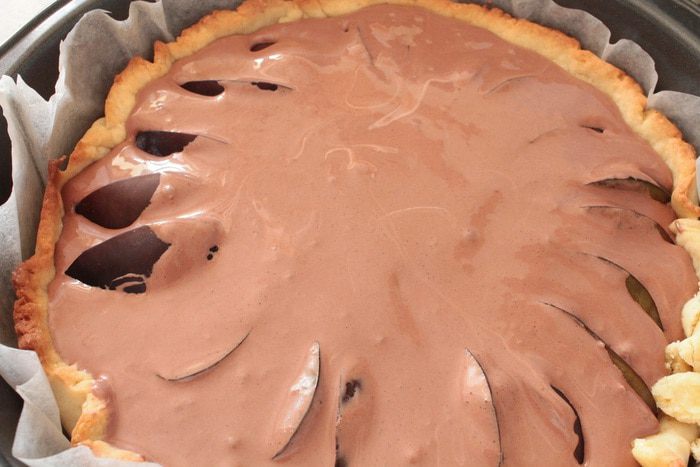 7. Затем приготовленную заливку из пудинга. Сливовый пирог с шоколадным пудингом