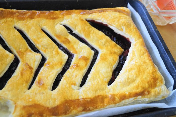 1. Слоеное тесто, если оно из морозилки, необходимо разморозить, немного раскатать на припыленой мукой поверхности. Выложить на противень застеленный пергаментом. Слоеный пирог с яблоком и вишней
