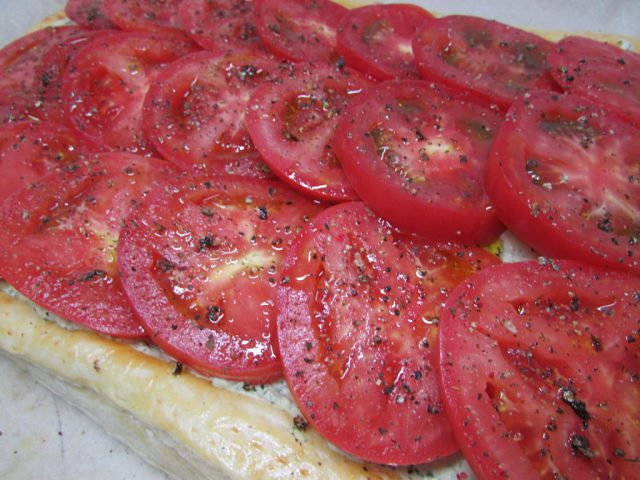 10. Затем выложить помидоры внахлёст. Сбрызнуть оливковым маслом, посолить, поперчить и отправить в духовку (убавить до 180 градусов) ещё на 25 минут, до готовности. Слоеный пирог с помидорами и базиликом