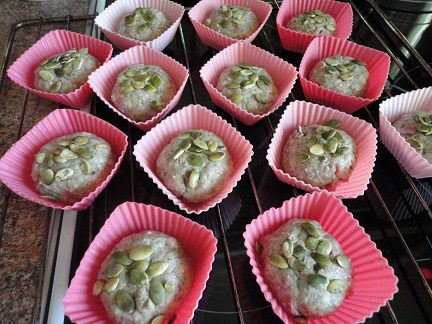 6. Разделать на кусочки по 40 — 50 граммов, скатать в шарики и уложить в формочки. У меня получилось 14 штук. Смазать желтком и посыпать оставшимися семечками. Дать расстояться еще полчаса. Словацкие закусочные булочки