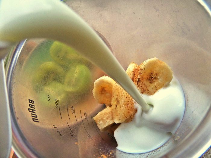 4. Влить охлаждённый кефир в стакан для взбивания на бананы. Смузи из ревеня, киви и банана