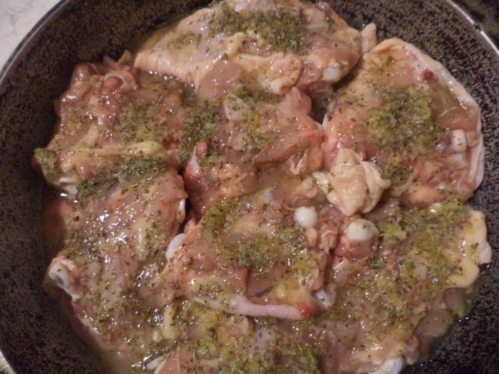 1. Куриные бёдра вымыть, обсушить бумажным полотенцем и выложить в смазанную растительным маслом форму для запекания кожицей вниз. Сочная курочка в медовой глазури