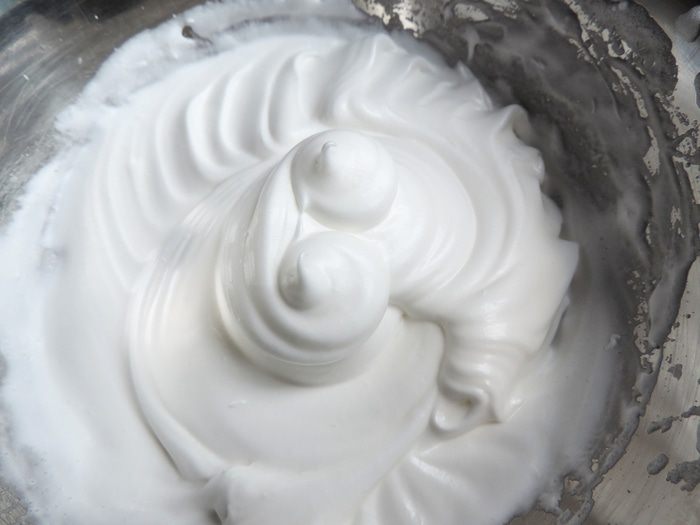 3. Не прекращая взбивания, в несколько приемов добавляем сахар. Взбиваем, пока не добавим весь сахар. Мы должны получить гладкую глянцевую массу с устойчивыми пиками. Шоколадно-ореховое печенье (без муки)