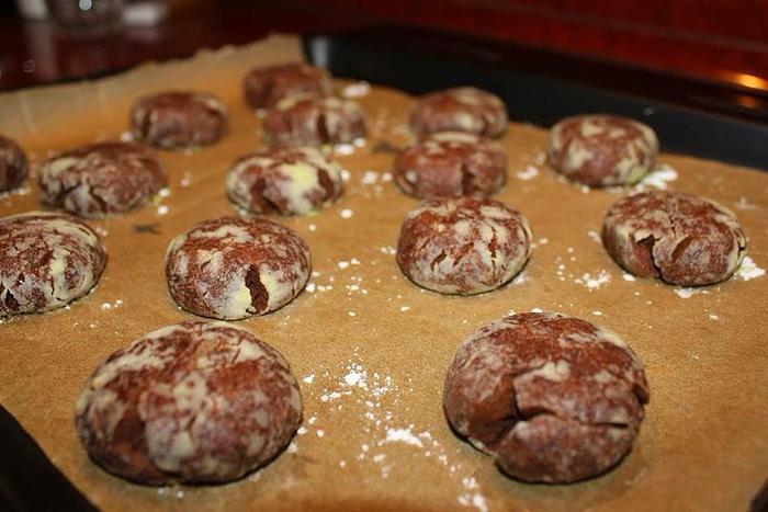 8. Выпекайте минут 10-12 при температуре 165°C. Пряники немного поднимутся, появятся характерные трещинки. Шоколадные пряники с трещинками
