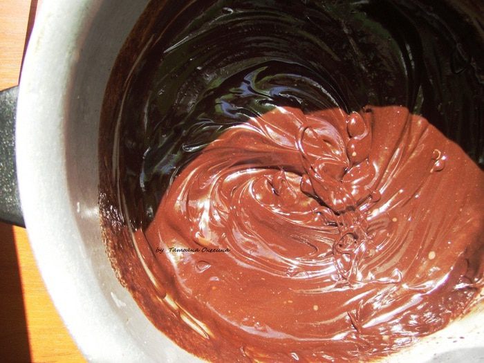Ставим на маленький огонь топиться, не мешаем и не отходим. Как только шоколад начинает плавиться , наливаем 100 мл сливок и даем немного прогреться. Снимаем с огня и лопаткой перемешиваем шоколад до однородного состояния. Если шоколад свернулся, добавьте немного теплых сливок и перемешайте венчиком.