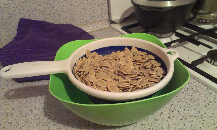 4. Когда семечки сварились, высыпаем их в дуршлаг и сливаем полностью с них жидкость. Соленые тыквенные семечки