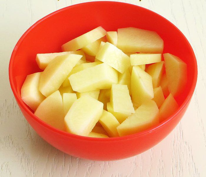 2. Далее чистим картофель и нарезаем его на небольшие кусочки. Суп-пюре из брокколи с гренками