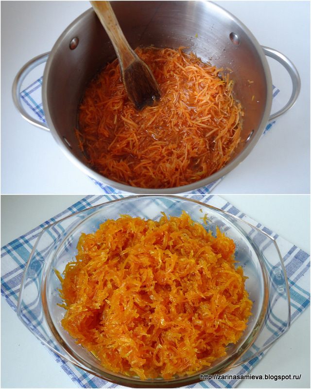 6. Все ингредиенты смешать в одной кастрюле. Кастрюлю поставить на огонь, довести смесь до кипения, огонь убавить на медленный. Варить до готовности в течение 30 минут. За это время сироп уварится, а морковь станет прозрачной. Готовый джем переложить в стеклянную посуду и убрать в холод остывать.
