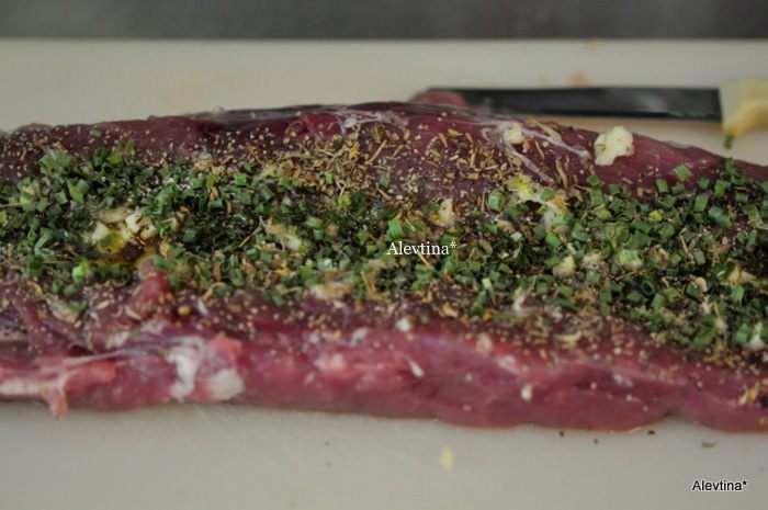 2. Смазать оливковым маслом 1 стол.л поверхность свинины. Посолить и поперчить по вкусу. Выложить затем порубленный чеснок мелко, шнитт лук,орегано, у меня он сухой. Свинина с начинкой из лука и чеснока