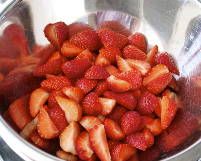 5. Пока выпекается основа для тарта, приготовим клубничный курд... Клубнику вымыть, перебрать, удалить листики. Нарезать кусочками и положить в миску, которую нам будет удобно поставить на водяную баню. Добавить 40 мл воды и уваривать клубнику на водяной бане... Процесс будет не самым быстрым, у меня ушло на приготовления курда около 30 минут (как раз пока выпекался корж!). Тарт с клубничным курдом