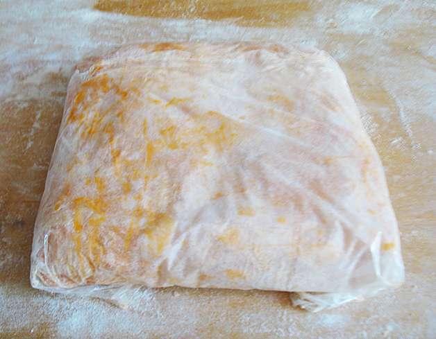 10. Мучной блок закрываем краями масляного блока, сначала завернуть боковые короткие стороны, а затем длинные. Края нужно тщательно "запечатать" со всех сторон. Заворачиваем в пленку и отправляем на 2 часа в холодильник. Томатное слоеное тесто