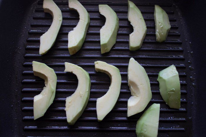 5. Сбрызгнуть ломтики оливковым маслом и обжарить на гриле по 2 минуты каждую сторону. Томатный салат с авокадо-гриль