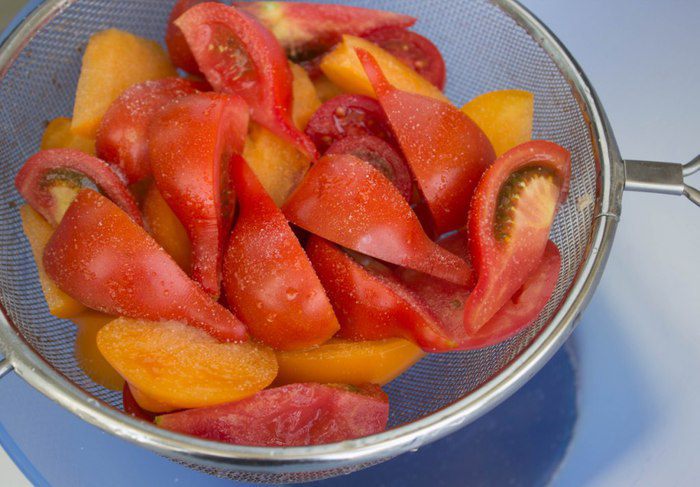 3. Сложить порезанные помидоры в дуршлаг, посыпать солью, перемешать и оставить на 20 минут, чтобы стек лишний сок. Томатный салат с авокадо-гриль