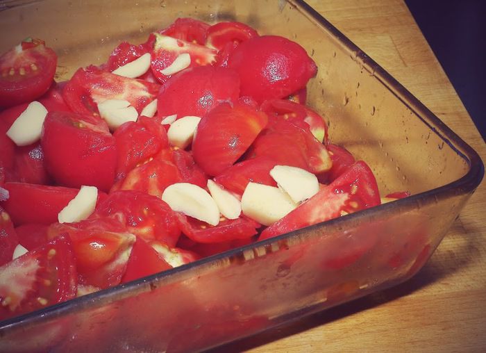 2. Режем помидоры дольками, складываем в форму вместе с крупно порезанным чесноком. Запекаем в духовке при 180 градусов примерно 40 - 45 минут. Томатный суп-пюре