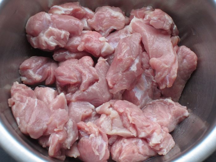 1. Мясо по мыть и обсушить бумажным полотенцем.Нарезать крупными кубиками. Томленая телятина с розовым перцем