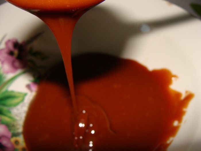 17. Растапливаем сахар, пока крупинки исчезнут, и сироп станет нежно коричневого цвета. Важно не передержать! Иначе будет горчить. Затем добавим горячие сливки, активно помешивая. Масса сильно увеличится в объеме, затем осядет, поэтому позаботьтесь о высокой посуде заранее. Затем добавим сливочное масло. Торт " Кокетка"