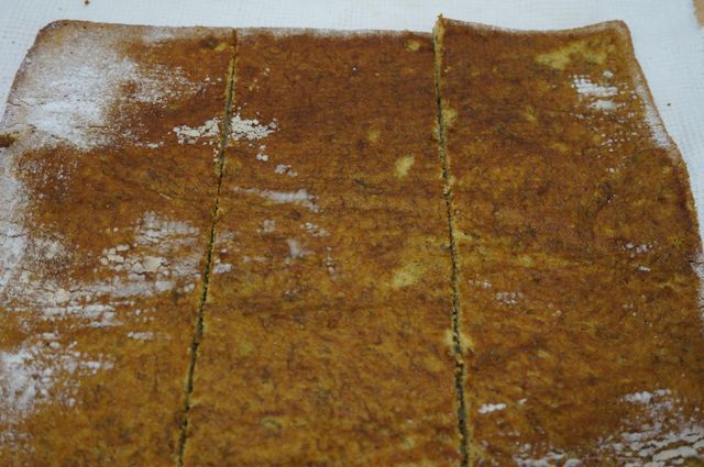20. Разрезаем банановый корж на 3 равных полосы, затем каждую еще раз пополам (можно сразу на 6 полос, если с глазомером все в порядке))). Торт "Банан с зеленым чаем"
