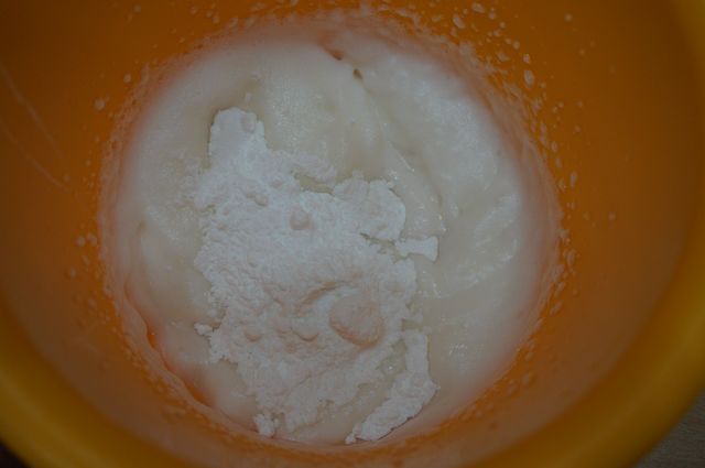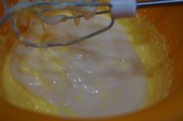 4. Вливаем желтки к белкам, взбиваем, либо аккуратно соединяем ложкой. Торт "Банан с зеленым чаем"