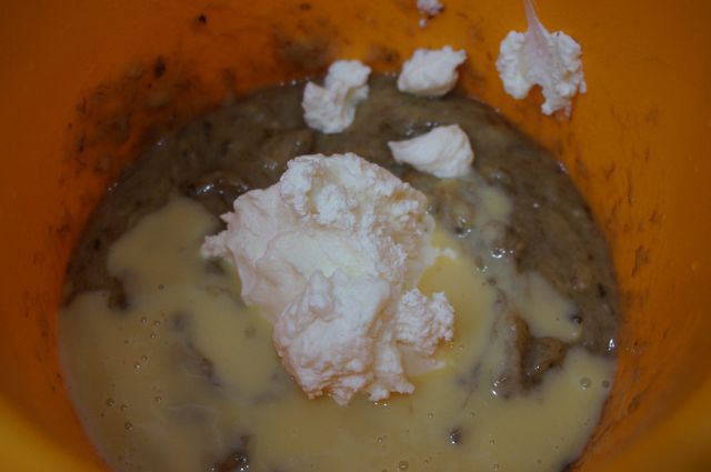 11. Во взбитые яйца добавляем банановое пюре, размешиваем. Торт "Банан с зеленым чаем"