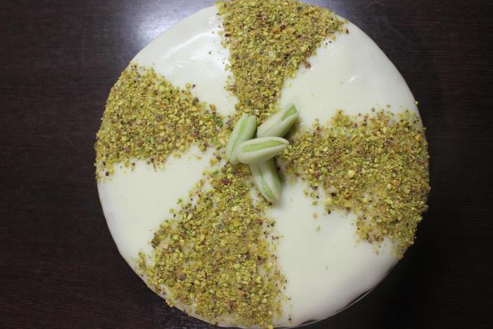 13. Я украсила середину тортика самодельными орешками-фисташками из марципана.